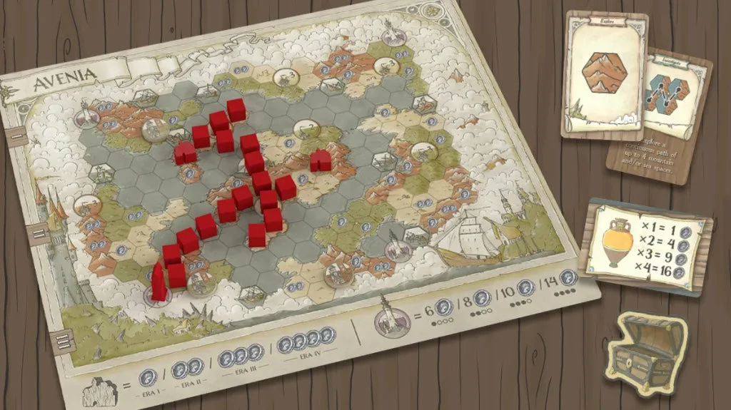Shuffle the deck of terrain cards, then reveal most of these cards one by one. Based on the terrain revealed, each player places on their board cubes that are connected to their starting city or other cubes. You want to complete areas on your board, cross the seas to new land, and establish new cities on the board. You can explore capsized ships for treasure — which gives you special placement capabilities — and create linked connections between locations to score bonus points. Common objectives can be completed by all players, with those who complete it first scoring more points.