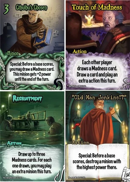 Smash Up: The Obligatory Cthulhu Set features crazy Cthulhu cultists, fishy Innsmouth locals, horrifying Elder Things, and good old Miskatonic University members (the Fightin’ Cephalopods). To be certain we got it right, this set also includes a new card type fittingly known as “Madness” that each of these groups can use to various effects. Just remember that Madness brings you power but at a price (joking!).