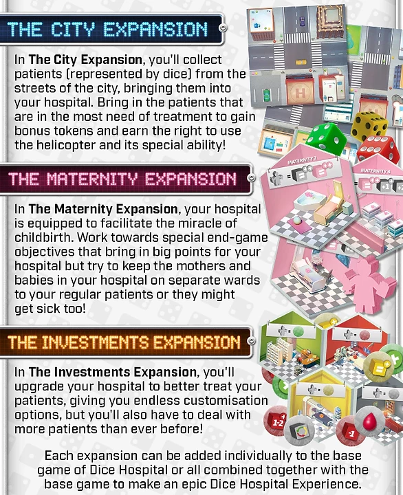 Dice Hospital: Community care is the new box with 3 expansions for the original game: Dice Hospital.