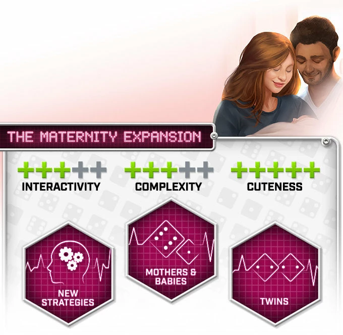 This expansion includes normal sized pink mother dice and smaller pink baby dice! This expansion also increases interaction by making players compete for objective cards set by the “city” to ensure a good amount of mother and baby dice are discharged (with often other color combinations) by the end of the game. This also includes a new spatial element to the game in which mothers only neglect when untreated and in a ward with other dice. Players also roll the birthing die to see whether they receive single or twin babies!