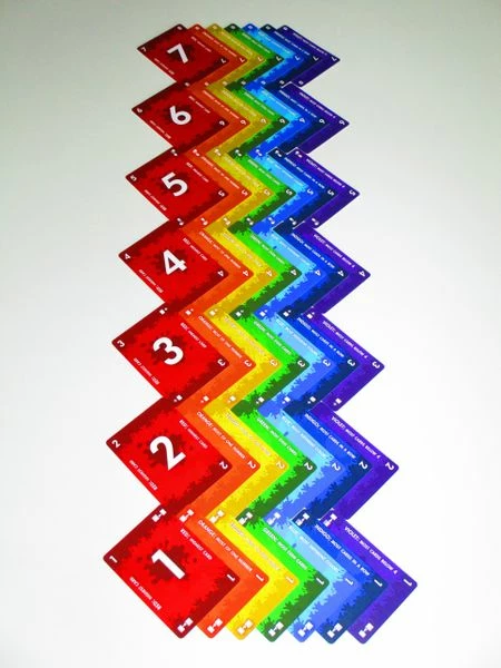The deck in Red7 is 49 cards: each of the colors of the rainbow numbered 1 to 7. A hand takes just a couple minutes!
