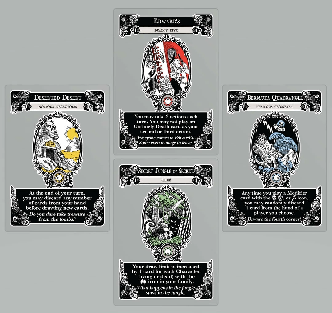 Unfortunate Expeditions introduces expeditions into the game. Only one expedition can be in play at a time. An expedition’s rules affect all players as long as it remains in play. When you play a modifier of untimely death that has an expedition symbol, resolved the immediate effects of the card, then replace the current expedition with the one shown on the card. Some cards also have special effects that occur if an active expedition is already in play when the card is played.