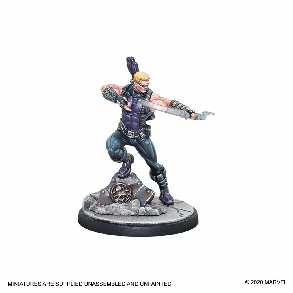 Marvel: Crisis Protocol – Hawkeye & Black Widow contains a miniature of each character, two character stat cards, two team tactic cards, and ten tokens.