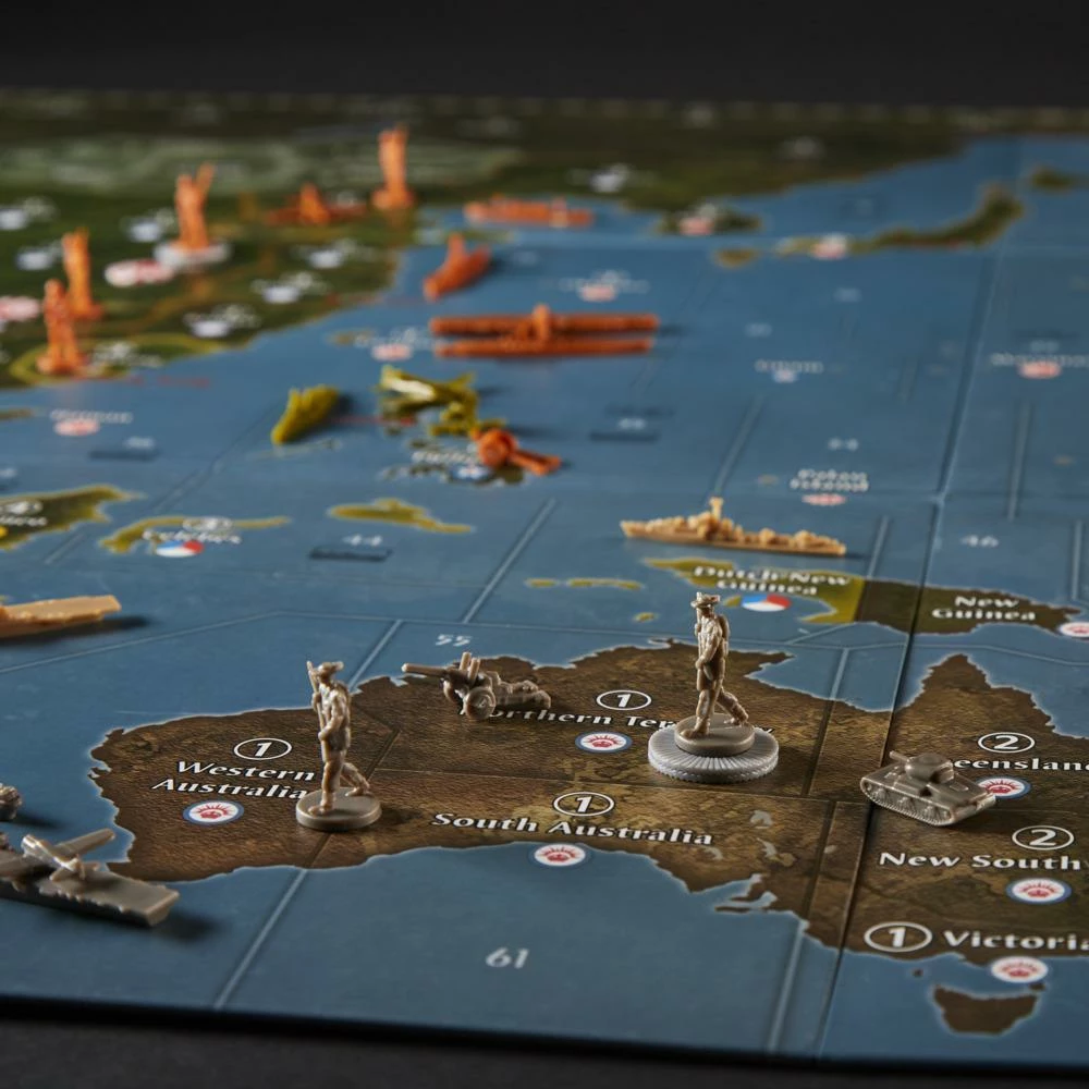 Axis & Allies Pacific 1940 (Second Edition) features an oversized board that measures 35 inches wide by 32 inches high (89 x 81 cm). With over 450 pieces, deluxe game components and local storage boxes, this game raises the standard established by A&A Anniversary Edition. All new rules for neutral nations, naval & air bases, kamikaze attacks and convoy disruption add even more depth and historical accuracy to this giant game.