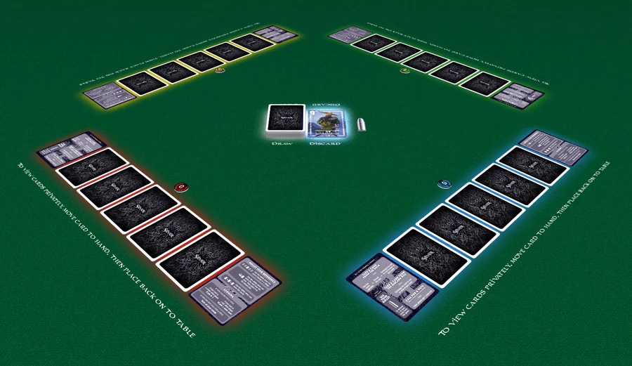 On a turn, you draw the top card of the deck or discard pile, then either discard it to use the power of the card (but only if it came from the deck), discard it without using the power (ditto), or replace one or more of your face-down cards with this card; you can replace multiple cards only if they bear the same number, and you must reveal the cards to prove this, being penalized if you’re wrong.
