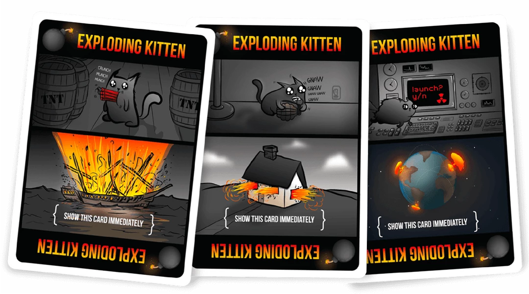 Exploding Kittens is a kitty-powered version of Russian Roulette. Players take turns drawing cards until someone draws an exploding kitten and loses the game. The deck is made up of cards that let you avoid exploding by peeking at cards before you draw, forcing your opponent to draw multiple cards, or shuffling the deck.