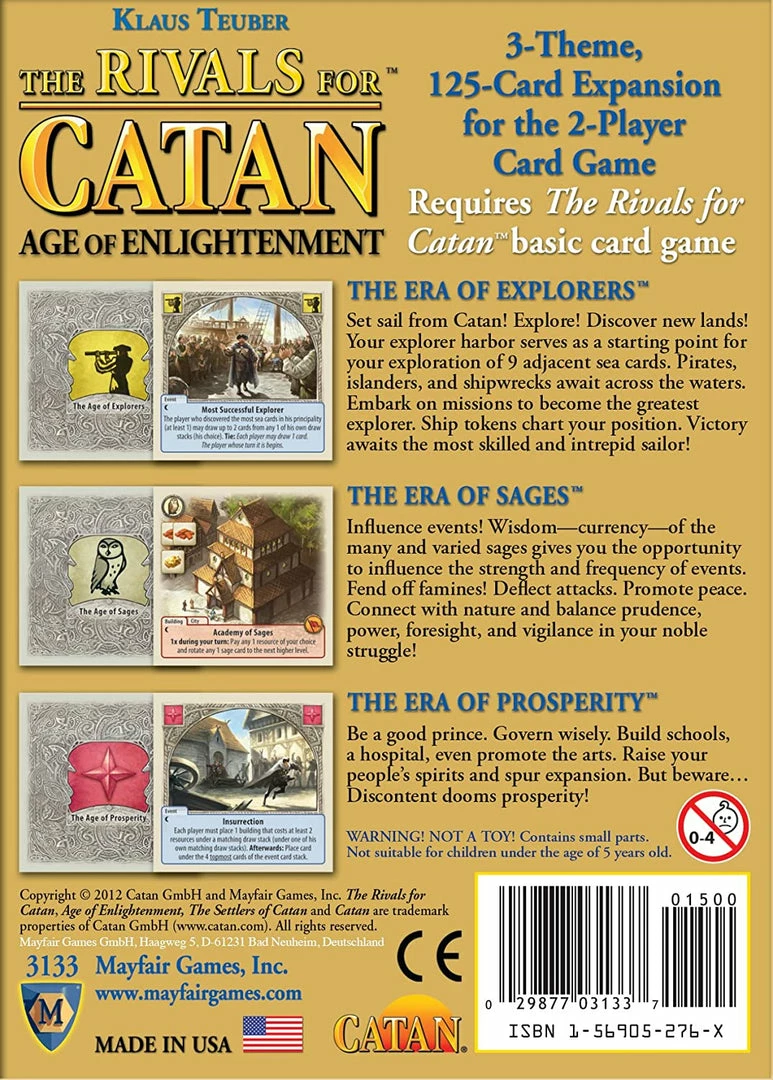 The Rivals for Catan: Age of Enlightenment contains three expansion sets (125 Cards Total) for The Rivals for Catan (released in Germany as Die Fürsten von Catan). These theme sets – “The Era of Explorers”, “The Era of Sages”, and “The Era of Prosperity” – offer new variety for the base game and bring new elements into play.