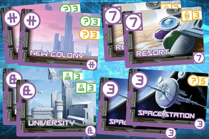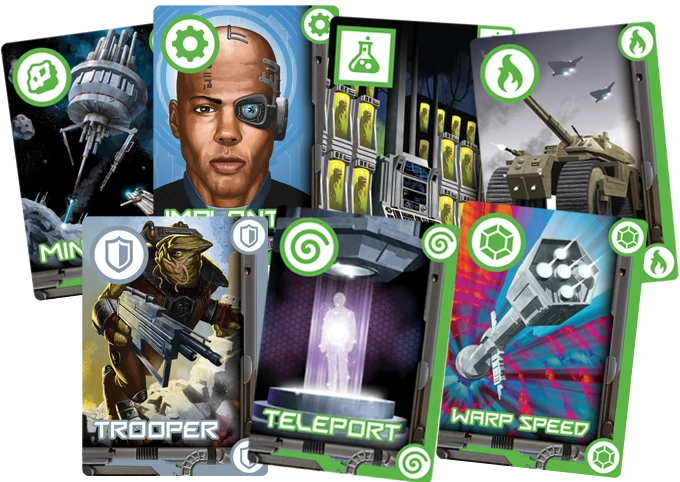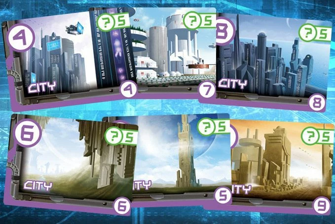 Each turn is divided in three different phases: Trade, Display and Draw cards. Each player at his turn can make a trade offer and each player in turn responds in kind. Using the cards through trading and drawing players work to acquire five identical race cards in order to build a Space Station (which increases the number of cards you can draw each turn) or five identical technology cards in order to build a City (which gives Victory Points). A variant play has been created in this game where each player, owns a planet divided in four different missions. If a mission is accomplished, more Victory Points are added to the sum and if a player completes all missions game ends.