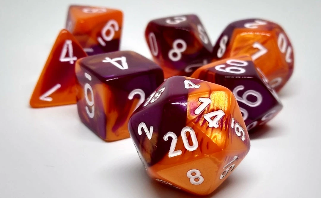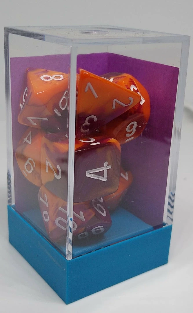 Chessex 30021 Gemini: Orange-Purple/White – Polyhedral (7 Dice)