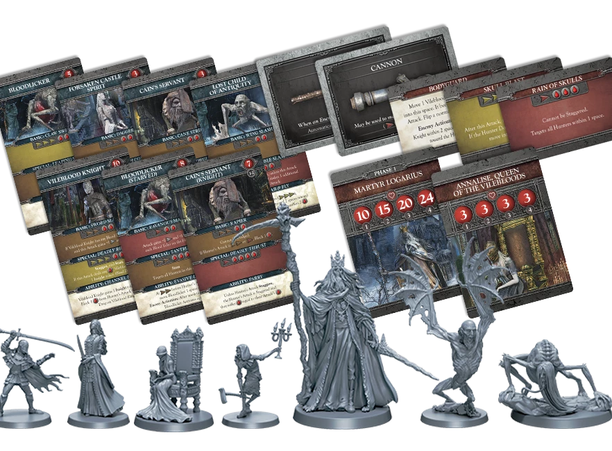 Forsaken Cainhurst Castle is a big box expansion that opens the doors to this fortress, represented by 12 new tiles, where you will be able to experience not just 1, but 2 full campaigns, plus a side-mission Chapter, all populated by 20 miniatures, including 5 types of Enemies and 2 Bosses!