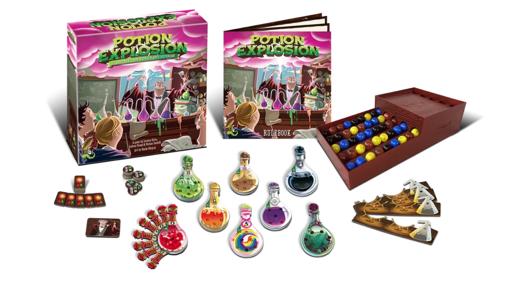 Dear students, it’s time for the final exams of the Potions class! The rules are always the same: Take an ingredient marble from the dispenser and watch the others fall. If you connect marbles of the same color, they explode and you can take them, too! Complete your potions using the marbles you collect, and drink them to unleash their magical power. Remember, though, that to win the Student of the Year award, being quick won’t be enough: you’ll also need to brew the most valuable potions in Potion Explosion!