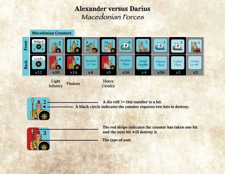 The heart of Alexander vs. Darius is a war weariness track, which moves down steadily for Alexander’s army. Historically, it did not reach zero until after his invasion of India, but a Persian battlefield victory could have changed that. The game also allows players to explore Memnon’s strategy of using Persian naval supremacy to raid Alexander’s rear as well as exploring the possibilities of the Spartan rebellion. Lastly, the Persians themselves must worry about legitimacy, and therefore must be active in resisting Alexander, or risk losing their grip on the throne.