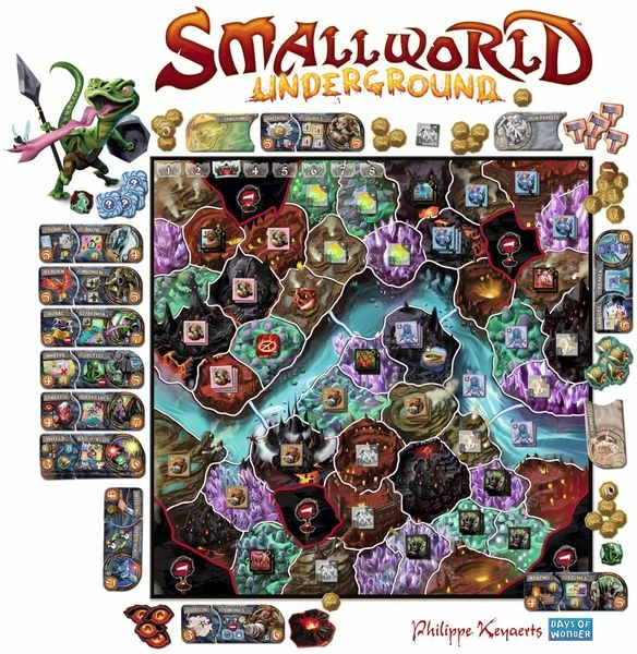 Small World Underground includes 15 fantasy-themed races of creatures along with 21 special powers. Each player will control several creature/power combinations over the course of the game – spending points to draft these combinations – and will use those creatures to claim control of various subterranean locations. Some locations hold relics or are designated as “places of power”, and monsters must first be conquered before a player can claim these special benefits. At the end of each turn, a player scores points for the regions he holds, and the player with the most points at game end wins.