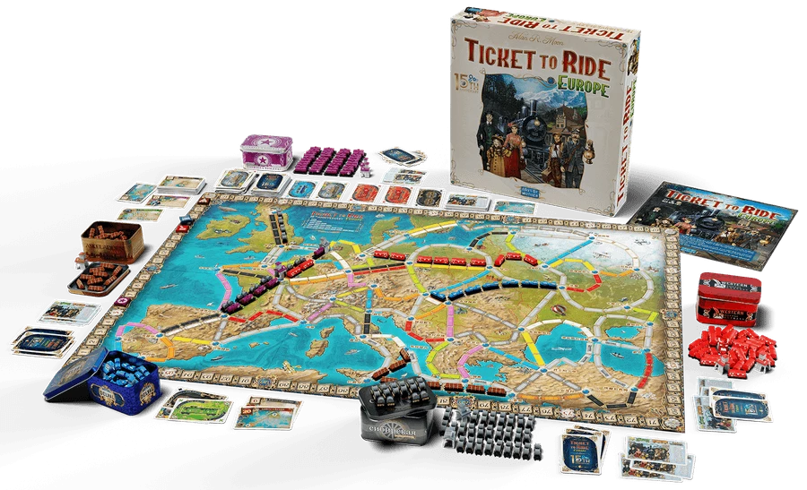 Ticket to Ride: Europe – 15th Anniversary contains material from the Ticket to Ride: Europe base game and the Europa 1912 expansion for a total of 108 destination ticket cards.
