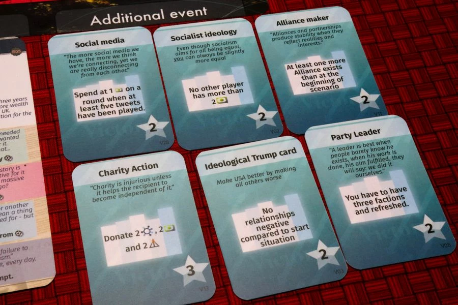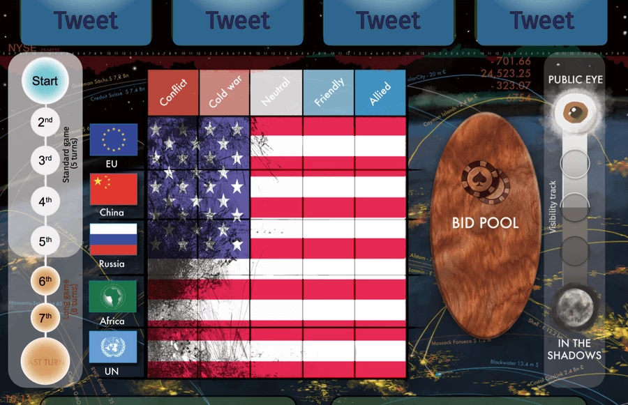 Gray Eminence does not pretend to observe political correctness or historical accuracy but rather aims to induce discussion about the world we live in. We also claim that all events in the game are plausible and event resolution options are within the range of real-world possibilities. We do not, however, pretend that our event resolution options cover all possible eventualities – If you find that you end up discussing event resolution options we didn’t list, that would count as a success in terms of our game design.
