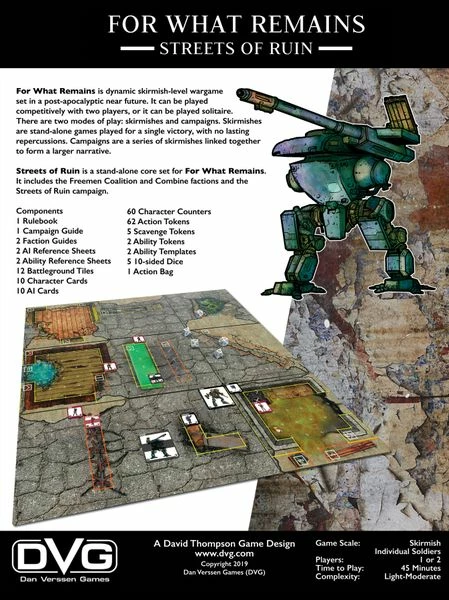 For What Remains is a skirmish-level series of three wargames set in a post-apocalyptic near future: