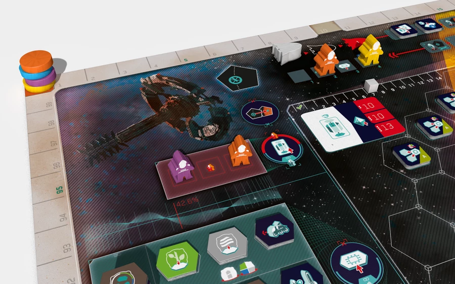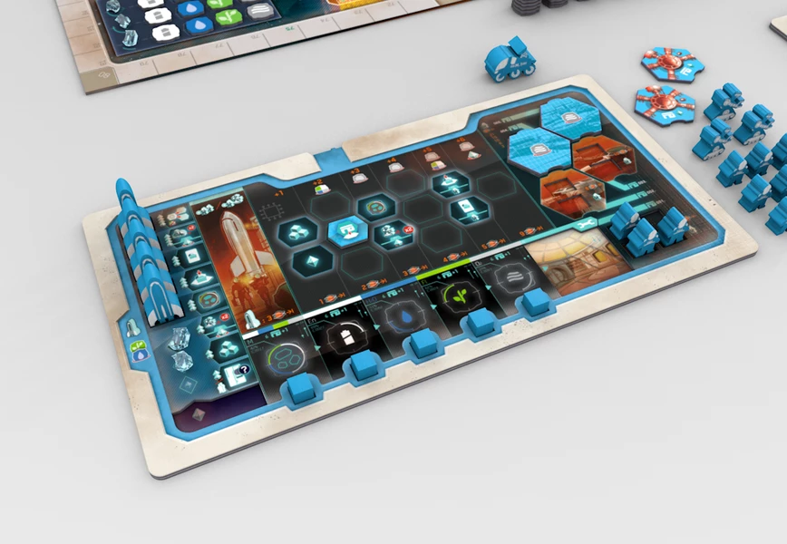 During the Colonization Phase, each player takes a turn during which they take actions. The available actions depend on the side of the board they are on. If you are in orbit, you can take blueprints, buy and develop technologies, and take supplies from the Warehouse. If you are on the surface of the planet, you can construct buildings with your bots, upgrade these buildings using blueprints, take scientists and new contracts, welcome new ships, and explore the planet’s surface with your rover. In the Shuttle Phase, players may travel between the colony and the Space Station in orbit.