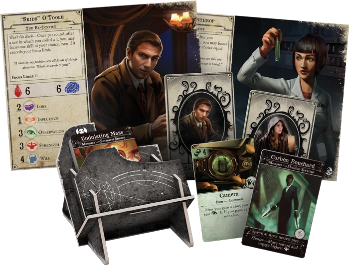 In Dead of Night, investigators explore the facets of Arkham best left unseen in the light of day. Organized crime builds a strong foothold in the city, secret cults labor for a dark master, an alien moon hangs overhead, and unknowable horrors stalk the night. is expansion includes two all-new scenarios, new encounters for every location in Arkham, new monsters and anomalies, and four new investigators to face these fresh horrors, armed with new spells, items and allies.