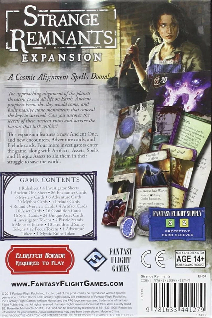 The new Mystic Ruins deck featured in this expansion allows investigators to explore Chichen Itza, the Easter Islands, Stonehenge and the Great Wall of China. New Glamour Spells and Relic Unique Assets offer you powerful tools in the struggle against a new Ancient One, and four more hardy investigators dedicate their lives to saving the human race. Four additional Prelude Cards introduce fresh scenarios and quests, transforming your games of Eldritch Horror.