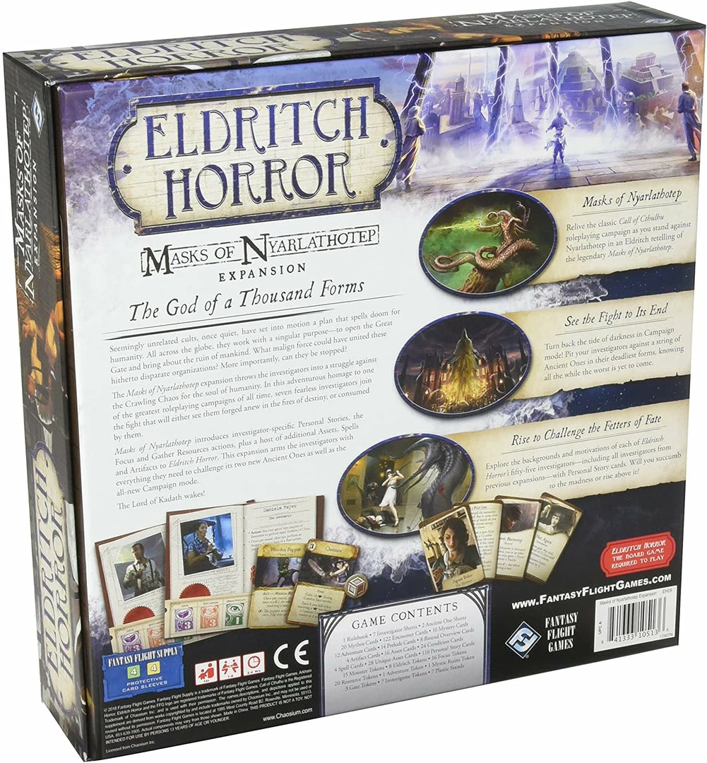 Eldritch Horror: Masks of Nyarlathotep is an expansion for Eldritch Horror, a cooperative board game for one to eight players in which intrepid investigators must traverse the globe in an attempt to thwart the cataclysmic rise of an otherworldly Ancient One. Strange cults are gathering strength in remote corners and bustling cities all over the world. Though they seem to worship different gods, the investigators have found a thread that runs throughout all of the cultists’ horrific rites.