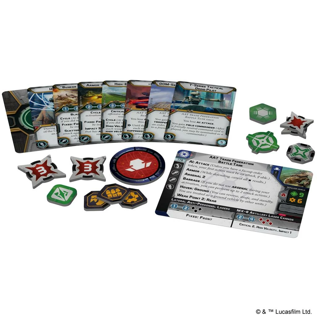 With the AAT Trade Federation Battle Tank Unit Expansion, you can add one of these heavy tanks to your Separatist army. The unpainted, finely-detailed miniature you find here can be constructed with its hatch closed or with a B1 Battle Droid scanning the horizon for new targets. In addition to this miniature, you’ll find everything you need to fully customize it to your personal strategy, including eight upgrade cards and a unit card.