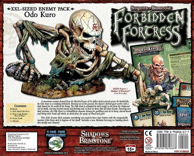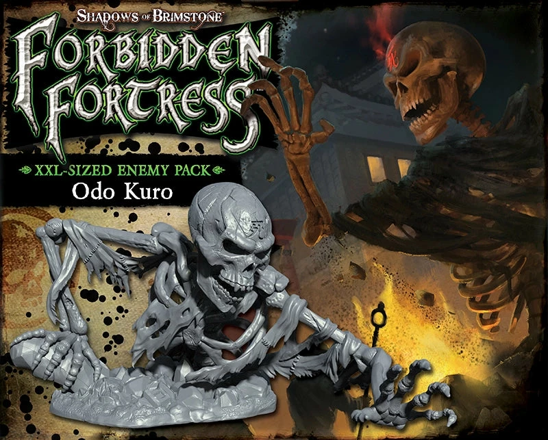 Formed from the amassed bones of the unburied dead that litter the battlefields across the land, the Odokuro is a massive skeletal creature that erupts from beneath the blood-soaked soil to attack unwary travelers, feasting on their flesh to feed its unquenchable hunger! Bursting out of the ground, it lashes out with its gigantic arms to claw and smash the Heroes, biting off the heads of its most unlucky victims and feeding on the spray of blood that erupts from their necks. The Odokuro is a terrifying beast to behold and the Heroes will need all of their courage to battle their way close enough to the creature to get past its bony defenses. This monstrous XXL Enemy Pack is themed for the Forest of the Dead OtherWorld (as well as the Forbidden Fortress World) and includes the giant-sized Odokuro miniature, Enemy Record Sheet, 1 Mission, and all of the cards needed to add this frightening fiend to your games of Shadows of Brimstone.