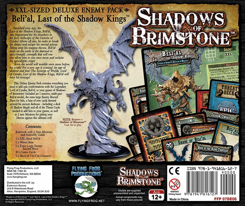 Shadows of Brimstone: Beli’al, Last of the Shadow Kings XXL Enemy, a Deluxe Enemy Pack, contains everything you need to add epic confrontations with the Legendary Lord of Cynder, Beli’al to your games of Shadows of Brimstone! Included are 1 massive, multi-part Beli’al model, the extra large Enemy Record Sheet for him, a host of new cards themed around his ancient darkness – including a deck of Shadow Magik and all of the Threat Cards needed to add him to your games, as well as 2 new Missions for pitting your Heroes against this ultimate evil!