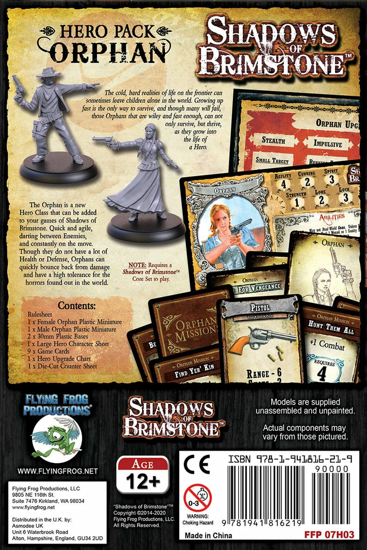 The Orphan is a new Hero Class that can be added to your games of Shadows of Brimstone. She is quick and agile, darting between Enemies, and constantly on the move. Though she does not have a lot of Health or Defense, the Orphan can quickly bounce back from damage and has a high tolerance for the horrors found out in the world.  Includes Male and Female Orphan miniatures in high-detail PLASTIC, two 30mm plastic bases, Orphan Double-Sided Hero Character Sheet, Rule Sheet, Orphan Upgrade Chart, Starting Upgrade Cards, Starting Gear, and Orphan Mission Deck.
