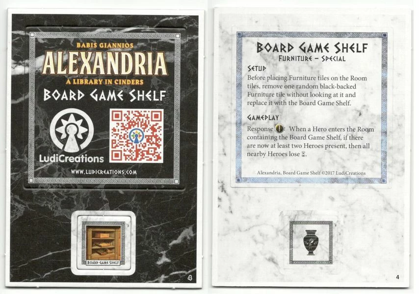 The Board Game Shelf replaces a random black-backed Furniture tile. When a Hero interest the Room containing the Board Game Shelf, if there are now at least two Heroes present, then all nearby Heroes lose time.