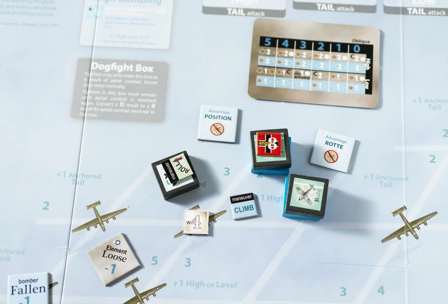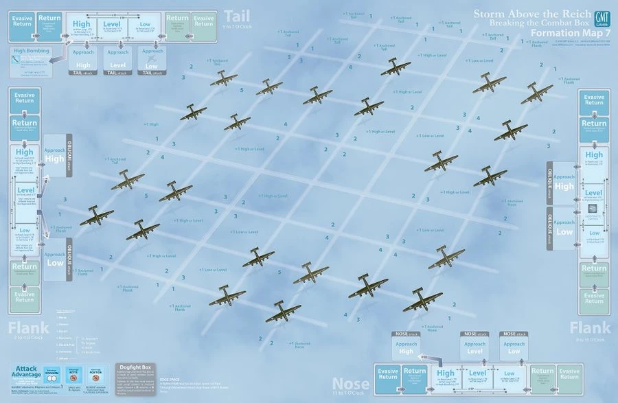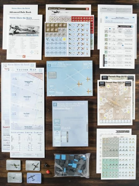 Stand-Alone and an Expansion: “Storm Above the Reich” is a stand-alone game; you don’t need “Skies Above the Reich” to play. However, it can also serve as an expansion for that game. Storm uses the same rules as Skies, and components in one game transfer seamlessly to the other. Combined, Storm and Skies present eight formation maps, six pursuit maps, B-17s and B-24s. In Storm, you get an oversized staffel of 18 Fw190s, with the option of augmenting it into a Sturmbocke staffel. In Skies, you get a staffel of Bf109s, and with the games combined, the staffels can also be combined.
