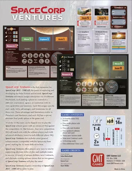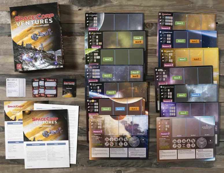 SpaceCorp: Ventures is the first module for SpaceCorp: 2025-2300AD, the game of exploring and developing the Solar System and beyond. SpaceCorp: Ventures introduces unique enterprises via fourteen HQ mats, each putting a player in control of a different corporation, agency, or institution with its own capabilities and missions. Each HQ assigns specific start cards, Infra, advantages, and limitations for all three eras. These advantages and limitations evolve in Planeteers and Starfarers, and each HQ has a special, alternate final profit option at game end.