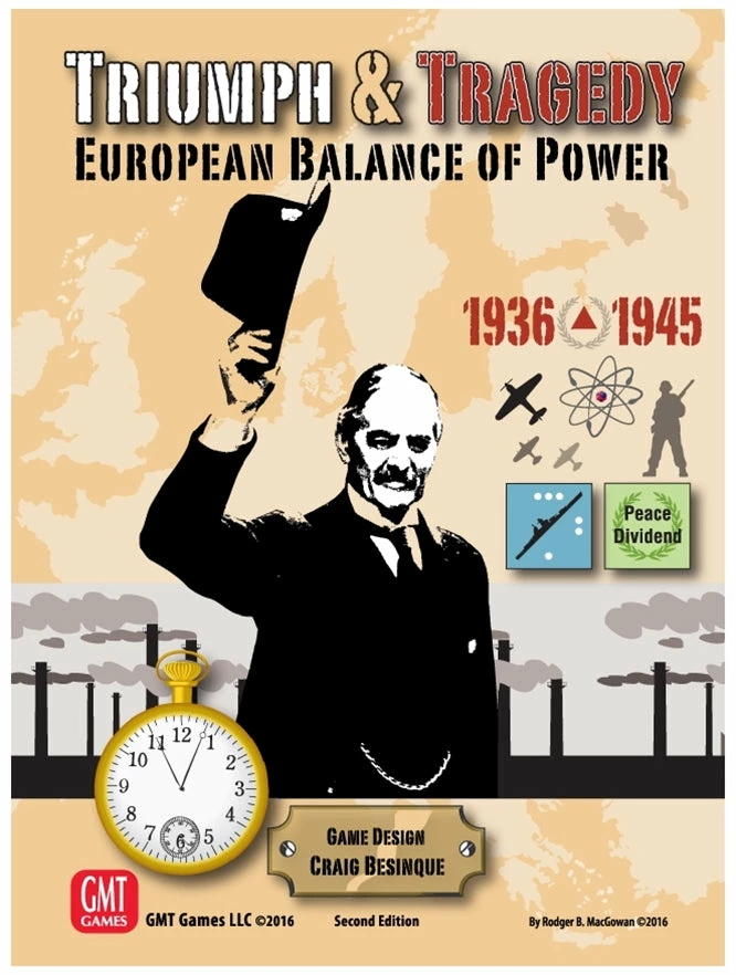 Triumph & Tragedy (Third printing) is a geopolitical strategy game for 3 players (also playable by 2) covering the competition for European supremacy during the period 1936-45 between Capitalism (the West), Communism (the Soviet Union) and Fascism (the Axis). It has diplomatic, economic, technological and military components, and can be won by gaining economic hegemony or technological supremacy (A-bomb), or by vanquishing a rival militarily.