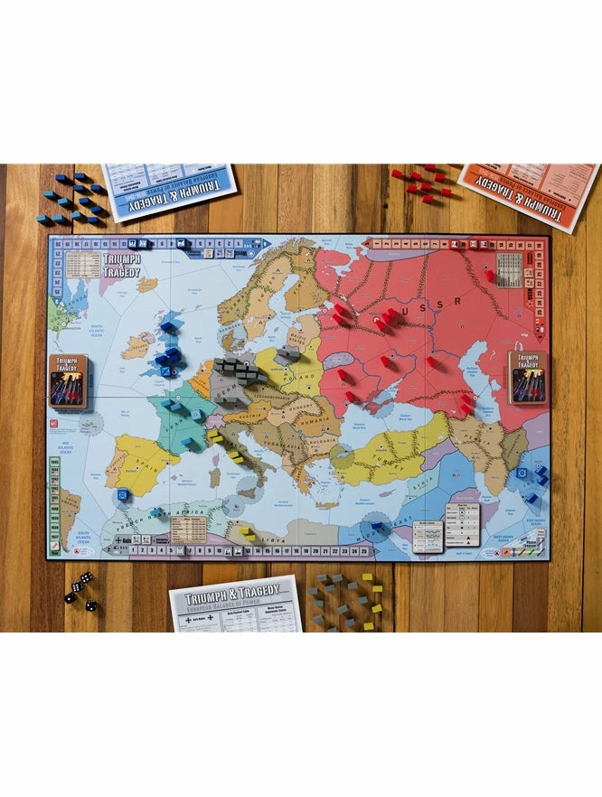 Triumph & Tragedy is a true three-sided game: there is no requirement that the West and Russia be on the same side (and in fact there are valid reasons to attack each other), and only ONE player can win the game. Table talk is allowed (and encouraged) but agreements are not enforceable. Alliances are shifting and co-operation is undependable. The game can continue as an economic battle of attrition or a sudden military explosion can change everything. There is immense replayability as players can pursue dominance in Europe via land, sea or air military superiority, technological supremacy, or economic hegemony without rivals realizing their strategy until it is TOO LATE! It is a highly interactive, tense, fast-moving game with little downtime between player turns, covering THE crucial geopolitical decade of the 20th century in 4-6 hours.