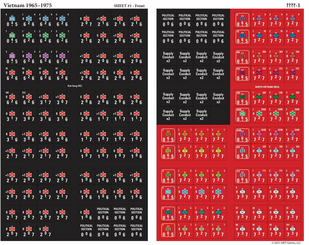 This simulation game re-creates the longest, most complex, and least understood conflict in US history in all of its military and political aspects. The rules include detailed treatment of movement, terrain, search and destroy operations, special operations, firepower, airmobility, riverines, brigade-level formations, limited intelligence, and auxiliary units in each scenario.