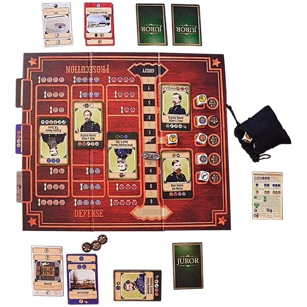 Unforgiven: The Lincoln Assassination Trial is a two-player game that takes place during the May 9 – June 28, 1865 trial of the first woman, Mary Surratt, ever to be executed for treason by the United States. The game begins amidst the chaos of Lincoln’s assassination as the country struggles to heal over the wreckage of the American Civil War. Each player must persuade the jury to convict or acquit the accused and thereby win the game. To do so, players draft and play cards that help them strengthen their case with the jurors and recruit them to their side, while also finding overwhelming evidence for or against the accused.