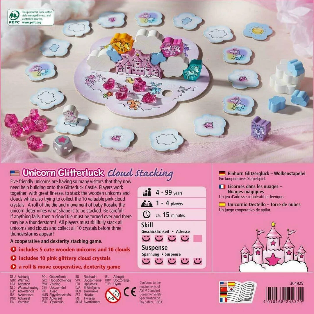 Players roll the die and move Rosalie forward the corresponding number of tiles, or if they land on a star – they fly to any tile of their choice. The tile on which you land determines your move. Land on a cloud, stack the corresponding white or blue cloud on the castle. Land on a unicorn, stack any of Rosalie’s unicorn friends on the castle. Land on a gem, place a crystal in the recessed board. What happens when the the parts fall down? Not to worry, the parts go back in the stock pile, the crystals stay put and the player must turn over a cloud card….what will it reveal? Sun = that’s lucky, thunderstorm = look out!