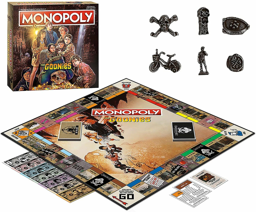 Relive the iconic 80’s movie The Goonies as you make your way through memorable moments and quests around Astoria, Oregon. Buy, sell, and trade your way to victory and collect “One Eyed” Willy’s treasure and be the last one standing in this collectible version of Monopoly.
