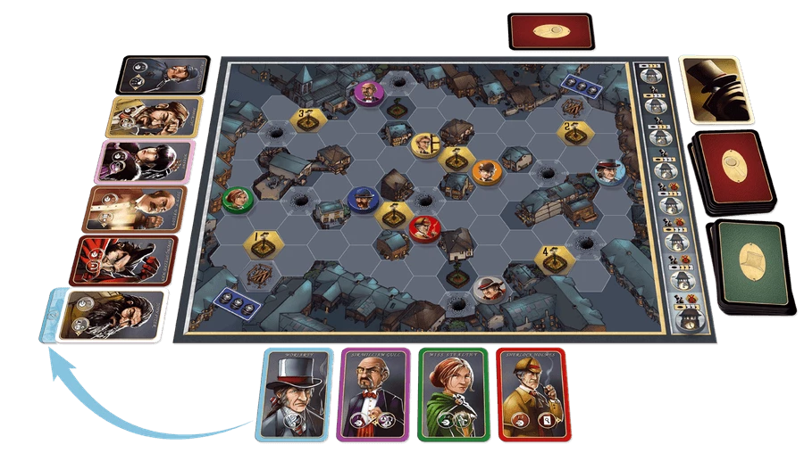 This expansion lets you play with six new characters: meet the sultry Madame, flee the terrifying Pizer, avoid the revolutionary Joseph Lane’s barricade, dodge Inspector Abberline’s probing questions, bound along London’s streets with the Spring-Heeled Man, and watch out for Moriarty. At the start of the game, choose which of the eight characters to play with via a draft and determine their starting locations. These new possibilities add fun and strategic depth.