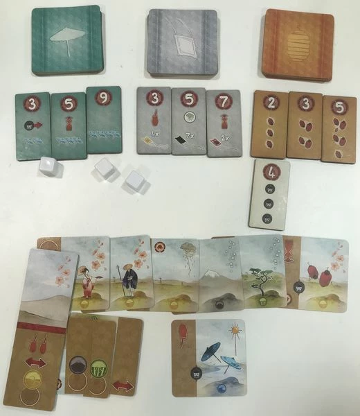 Kanagawa: Yokai includes cards and scoring elements for three new elements — kites, parasols, and paper lanterns — and to use them, you replace any two elements in the Kanagawa base game with two new elements.
