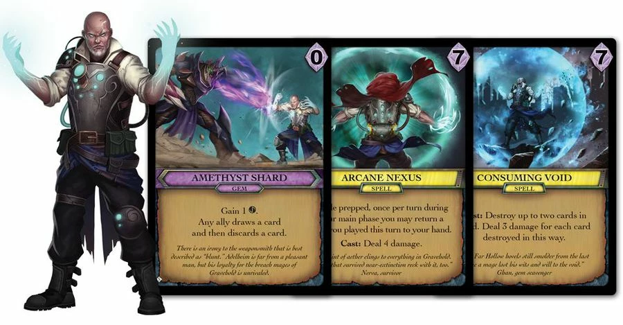 Aeons End is a Cooperative game that explores the deckbuilding genre with a number of innovative mechanisms, including a variable turn order system that simulates the chaos of an attack, and deck management rules that require careful planning with every discarded card. Players will struggle to defend Gravehold from The Nameless and their hordes using unique abilities, powerful spells, and, most importantly of all, their collective wits.