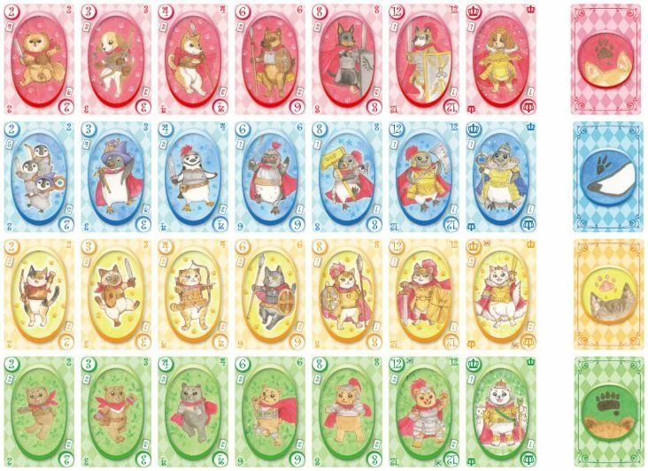 Each player has a different deck of sixteen cards. Usually you have to play cards with a higher rank than those played by the previous player, but if you’ve collected cards of the same rank and the total of that rank equals the total of the rank that previous player played, you can play those cards instead.