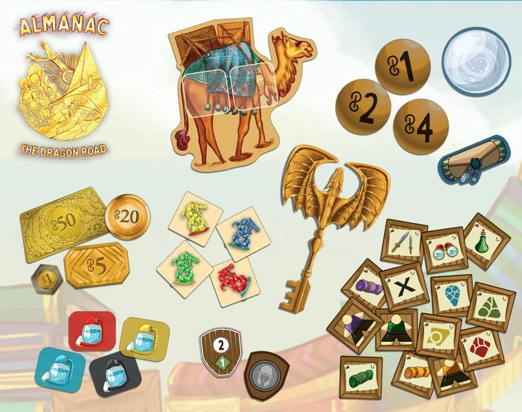 Almanac: The Dragon Road is the first entry in the Almanac series of games from acclaimed designer Scott Almes. Each round of the game is played on a different page in the game book, each page representing a unique location with a special twist on worker placement. Combining rich narrative and intuitive yet unique game mechanisms, every game is a new adventure!