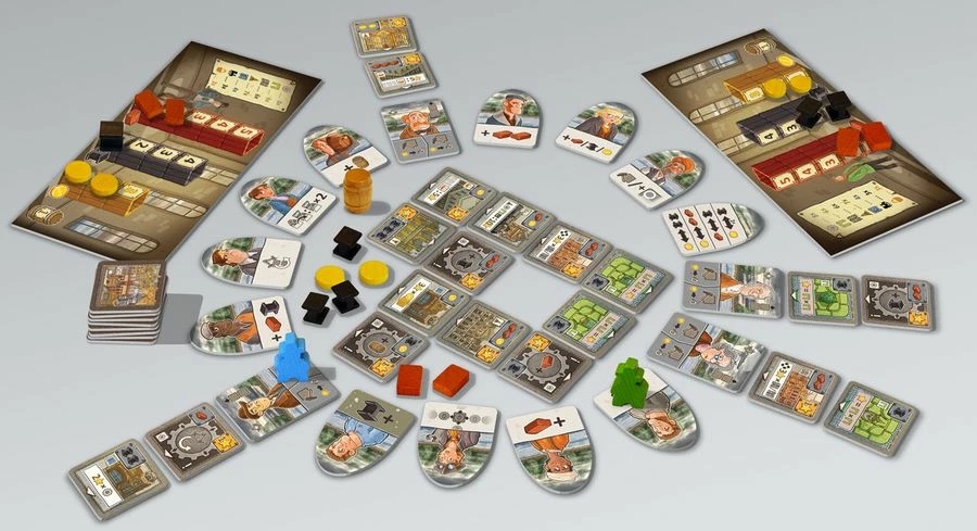 In slightly more detail, to set up the game, lay out a ring of town figures at random, with two of them being removed from play each game. Whoever is farther behind in the circle around town takes the next turn, advancing to whichever town figure they want to visit. Most of them give you resources — brick, steel, or money — and you have a limit on how many resources of each type you can hold. Some figures have two random building plans at them, and if you visit one with the right resources, you can pay them, then build something. If you pay extra, you can then build something else, too!