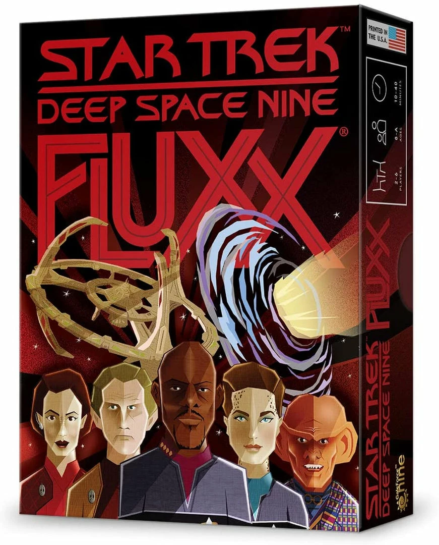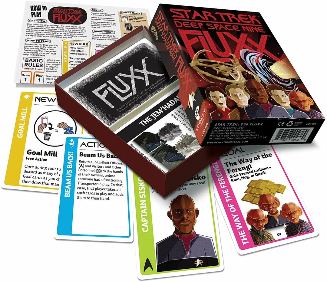 Explore the farthest reaches of the universe in Star Trek: Deep Space Nine Fluxx! Work alongside Benjamin Sisko, Quark, Jadzia Dax, Worf and all your other favorite space station personnel while you try to gather Gold-Pressed Latinum and study The Wormhole — but watch our for nasty Surprises and Creepers like the Founders and the Jem’Hadar.