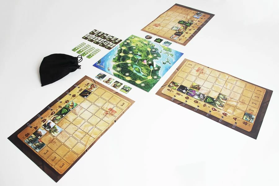 Tiles score and have effects in various ways, for example, with players gaining or losing points for meeting the most or fewest inhabitants. Flora and fauna tiles score only if you have a pair in a column, but only the highest-valued of this pair scores. Villages score only if you have more pairs of reception and GPS tiles than the number of villages, while the reception and GPS pairs net you no points, but allow you to get a tile from the pool of “known information”. Equipment makes it safe to explore volcanoes on the island, and if you don’t have enough equipment, you might lose other tiles you’ve collected.