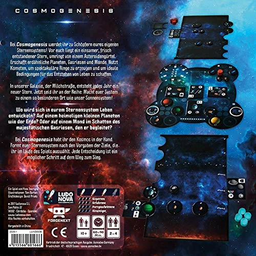 In a game of Cosmogenesis, each player creates their own planet system, starting from a star and an asteroid belt. To do this, they use the elements available on the different sections of the central board. In each round, players obtain one element from each of the four sections over four turns and with these elements players form planets and moons. These then collide with each other, causing them to increase in size, develop rings, form atmospheres, and of course create life. Players do all of this in order to fulfill their own objectives, which like the rest of the elements of the game, are obtained from the central board; at the end of the game, these provide the victory points that determine the overall winner.