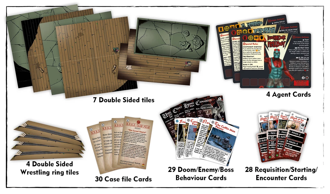 Hellboy: The Board Game – In Mexico is an expansion that adds gameplay elements from the “Hellboy in Mexico” storyline to Hellboy: The Board Game. This expansion consists of: