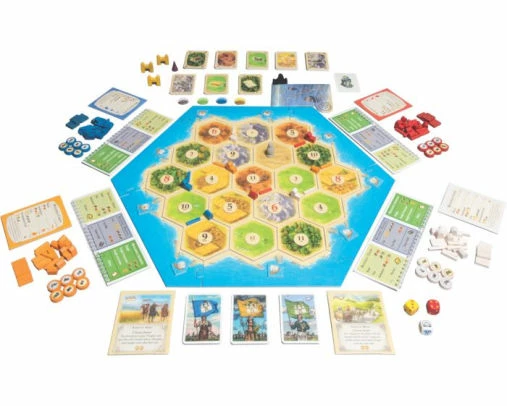 Setup includes randomly placing large hexagonal tiles (each showing a resource or the desert) in a honeycomb shape and surrounding them with water tiles, some of which contain ports of exchange. Number disks, which will correspond to die rolls (two 6-sided Dice are used), are placed on each resource tile. Each player is given two settlements (think: houses) and roads (sticks) which are, in turn, placed on intersections and borders of the resource tiles. Players collect a hand of resource cards based on which hex tiles their last-placed house is adjacent to. A robber pawn is placed on the desert tile.