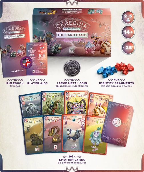 Cerebria: the Card Game focuses on occasions when the landscape of your mind interacts with the world and other people. In this turn-based card game, the players build their Mindsets, filling it up with Bliss or Gloom Emotions. The outside world is represented by the Impulse, a dynamically changing pool of available Emotion cards. Whenever the Impulse is emptied of Emotions, each player’s Mindset is scored, granting Bliss or Gloom Identity Fragments. The goal of the game is to collect enough Fragments to fully develop the Identity.