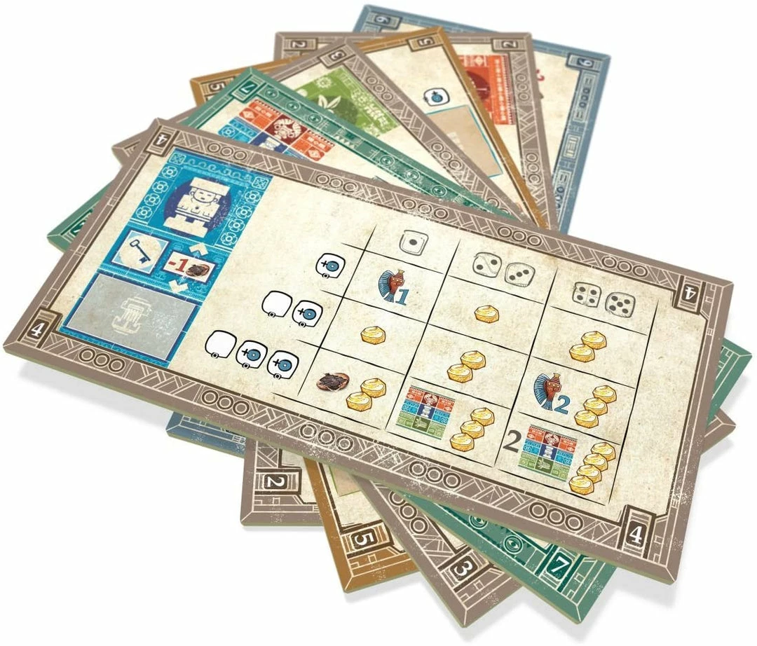 In Teotihuacan: City of Gods, each player commands a force of worker Dice, which grow in strength with every move. On your turn, you move a worker around a modular board, always choosing one of two areas of the location tile you land on: one offering you an action (and a worker upgrade), the other providing you with a powerful bonus (but without an upgrade).